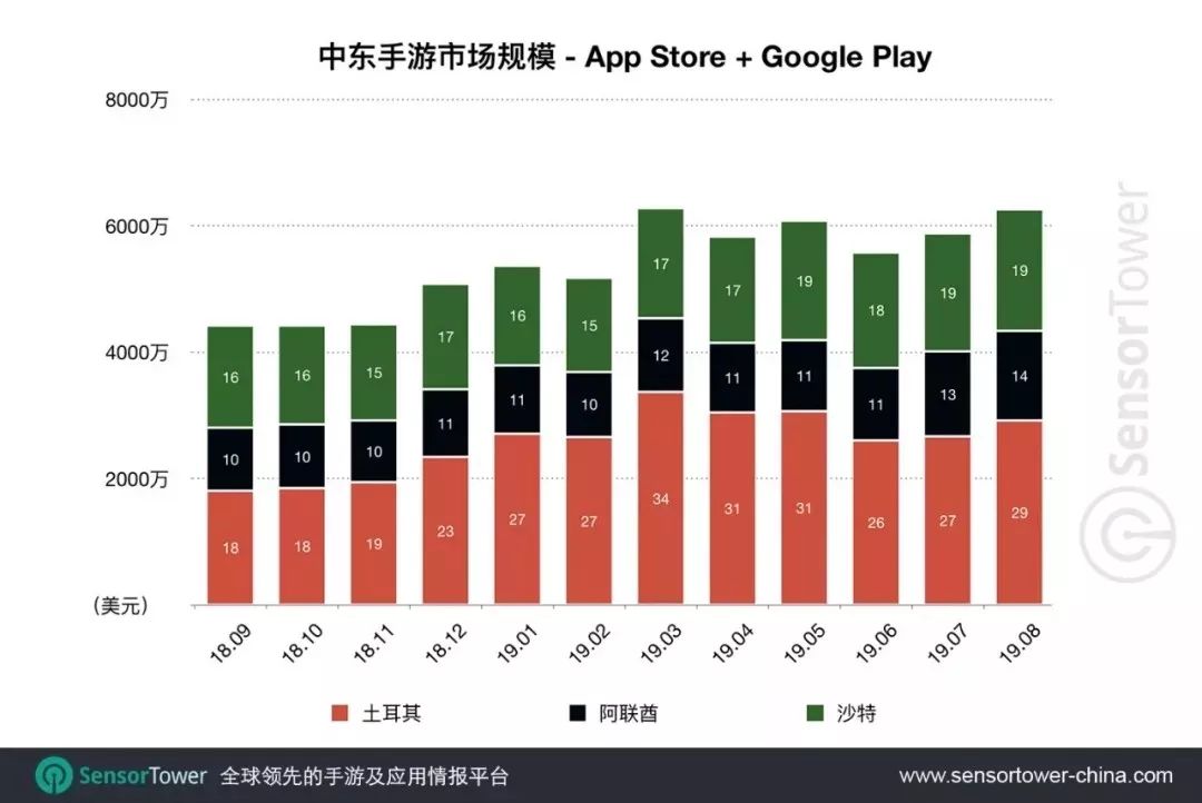 Sensor Tower 數(shù)據(jù)顯示,過去一年土耳其,阿聯(lián)酋和沙特手游市場仍處于快速發(fā)展階段。2019 年 8 月三個(gè)市場手游總收入達(dá)到 6200 萬美元,較 2018 年 9 月 4400 萬美元上漲 40.9%。