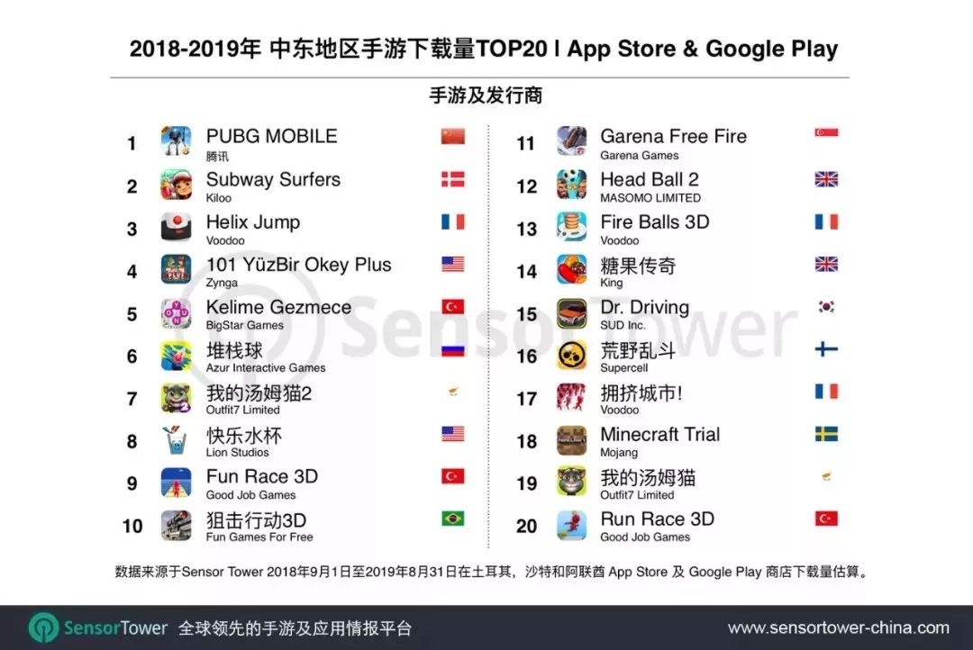 下圖為土耳其,沙特和阿聯(lián)酋三個(gè)市場過去一年手游收入 Top20 榜單。騰訊《PUBG MOBILE》吸金 1 億美元居于榜首,占該游戲海外總收入的 18.1%。榜單中,中國手游多達(dá) 11 款,占 Top20 總收入的 69%。