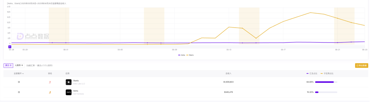 Starla 和 Astra 近 30 天收入|圖片來源:點(diǎn)點(diǎn)數(shù)據(jù)
