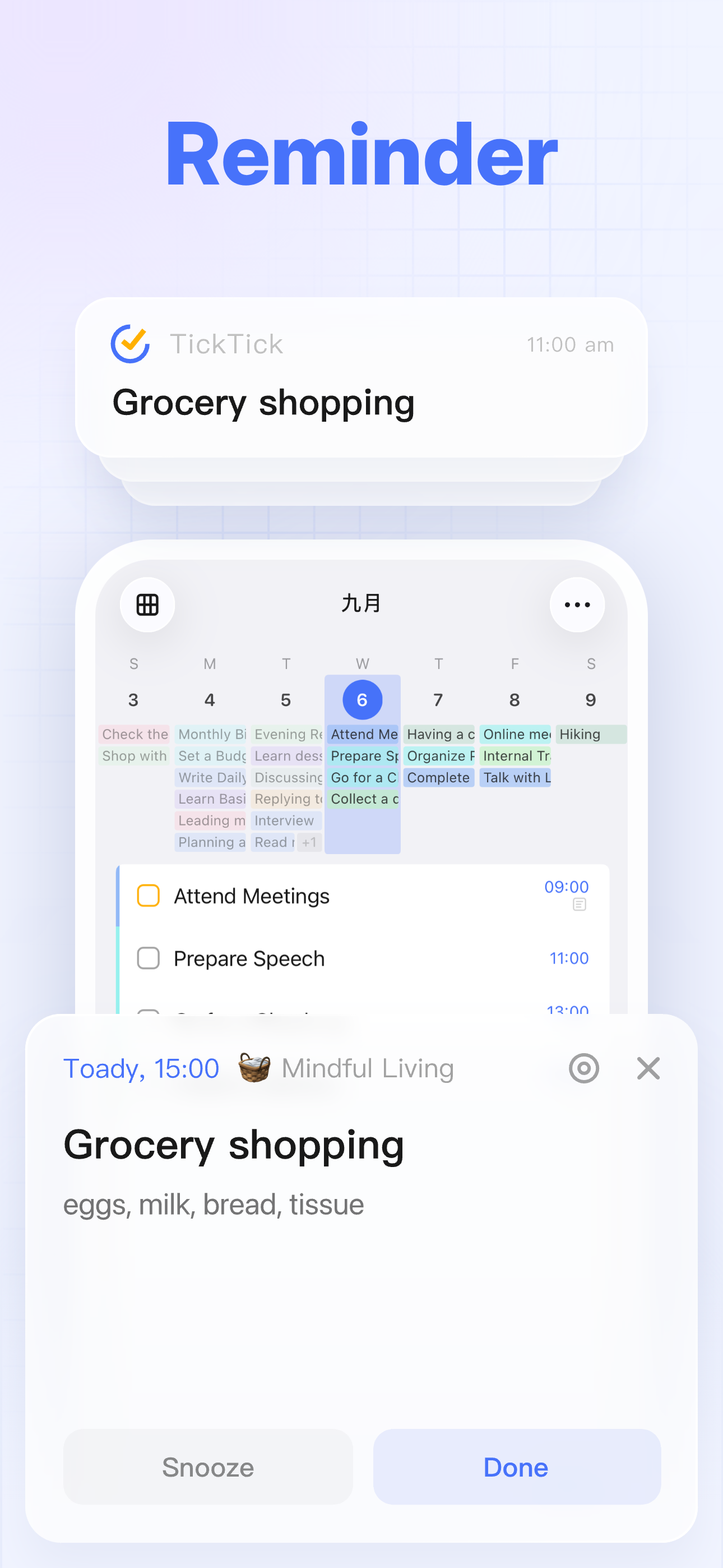 Delegate your memory to TickTick. It records all your tasks, providing immediate to-do list reminders to help you get things done. With multiple alerts for vital tasks and notes, you'll never overlook a deadline again