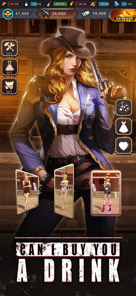 Recruit epic heroes and give them different jobs to help you develop your gang. Their secret stories will appeal to you. DATING with hero is available! Enjoy the crazy West!