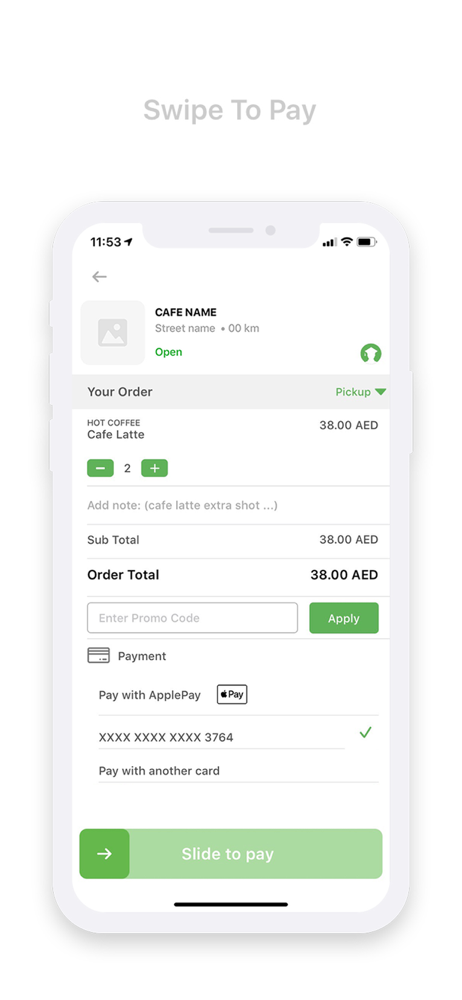 Swipe to pay for your order, all through the app.Grab Your food in 3 Steps: